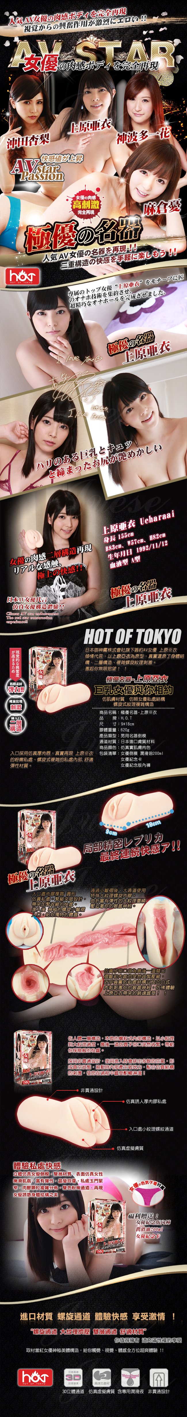 日本御神鷹株式會社旗下簽約AV女優 上原亜衣傾情代言,以上原亞衣為原型,真實還原了身體結構,二層構造,複雜螺旋紋理刺激。激起你無限慾望!