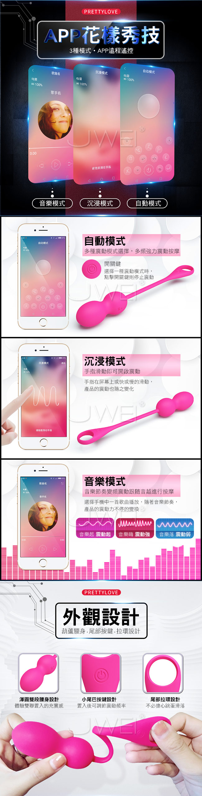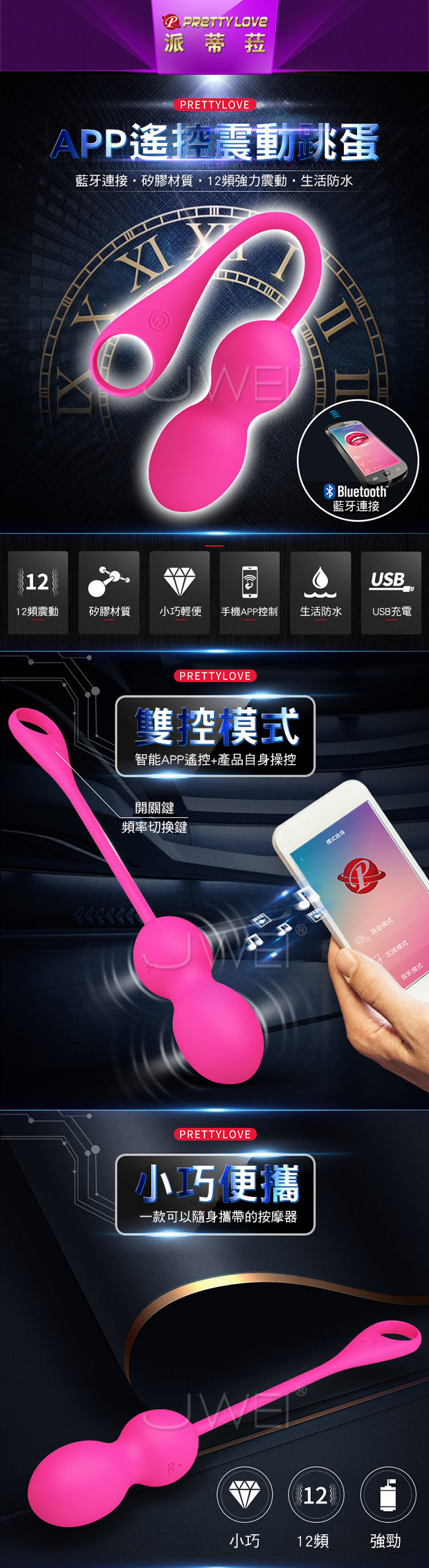 震動爽朗蛋採用雙控模式可用藍牙連接智能APP遙控或者使用產品自身操控,是一款可以隨身攜帶的按摩器。APP遠程遙控共3種模式供您選擇等您來探索,外觀設計為葫蘆腰身尾部按鍵拉環設計,渾圓雙段腰身設計體驗雙聯置入的充實感,不撐大您私處可鍛煉陰道進行凱格爾訓練喔~產品本身擁有12段變頻震動,強勁又力等您來體驗喔~