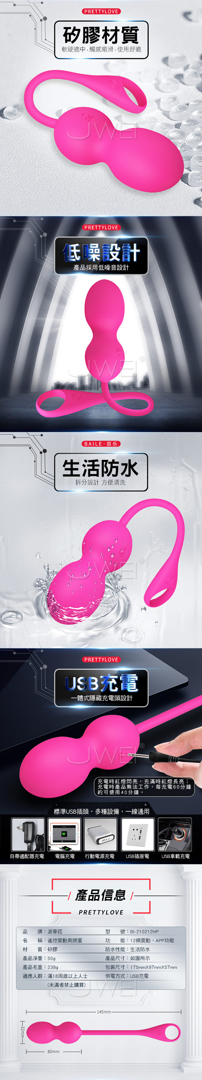 ■尺寸:詳如下圖所示 ■材質:矽膠 ■供電:USB充電 ■特色:12段變頻震動、APP遙控功能(三種模式)、生活防水、低噪設計
