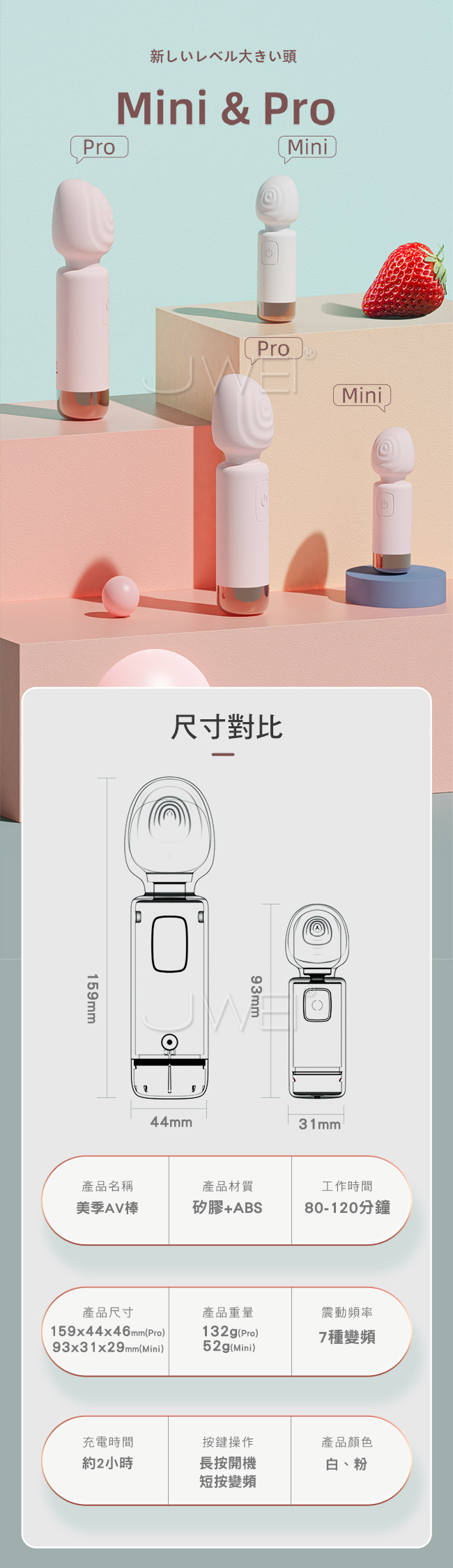■尺寸:大小詳如圖片標示 ■材質:矽膠、ABS ■供電:USB充電 ■特色:12段變頻、生活防水、一鍵開啟
