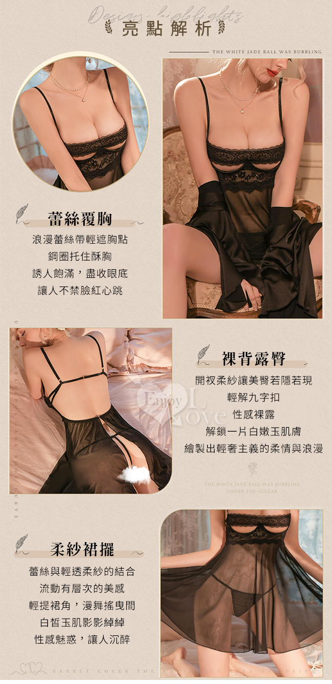 情趣睡衣!鋼圈托乳蕾絲帶覆胸輕透柔紗後開襟連身裙兩件組﹝白﹞