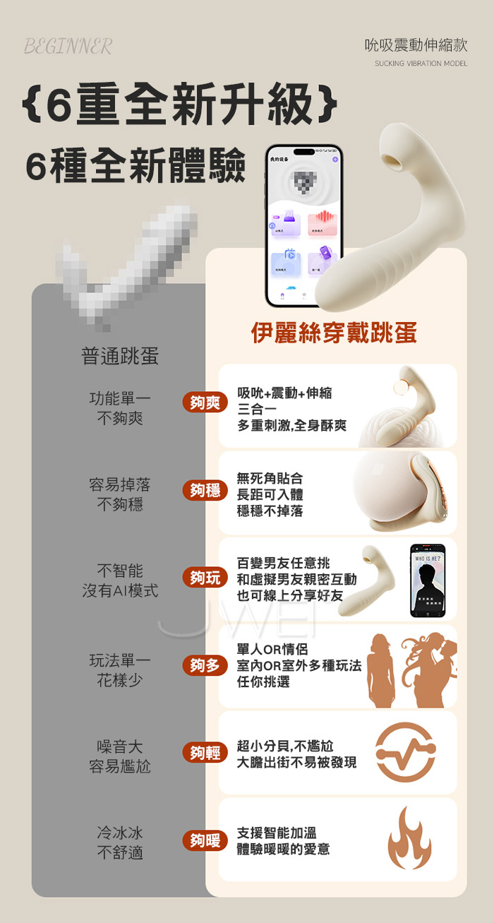 伊麗絲跳蛋,不一樣的穿戴情趣,AI男友親密互動!多樣人設滿足不同幻想~ 吮吸+震動+伸縮 三合一多功能刺激,全身酥爽!無死角貼合密道穩穩不掉落 智能升溫 告別冰冷,暖暖得更貼心,享受更溫暖的愛~ ■尺寸:大小詳如圖片標示 ■材質:矽膠+ABS ■供電:針孔充電 ■特色:10頻伸縮震動、APP智控、加溫
