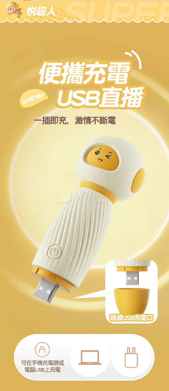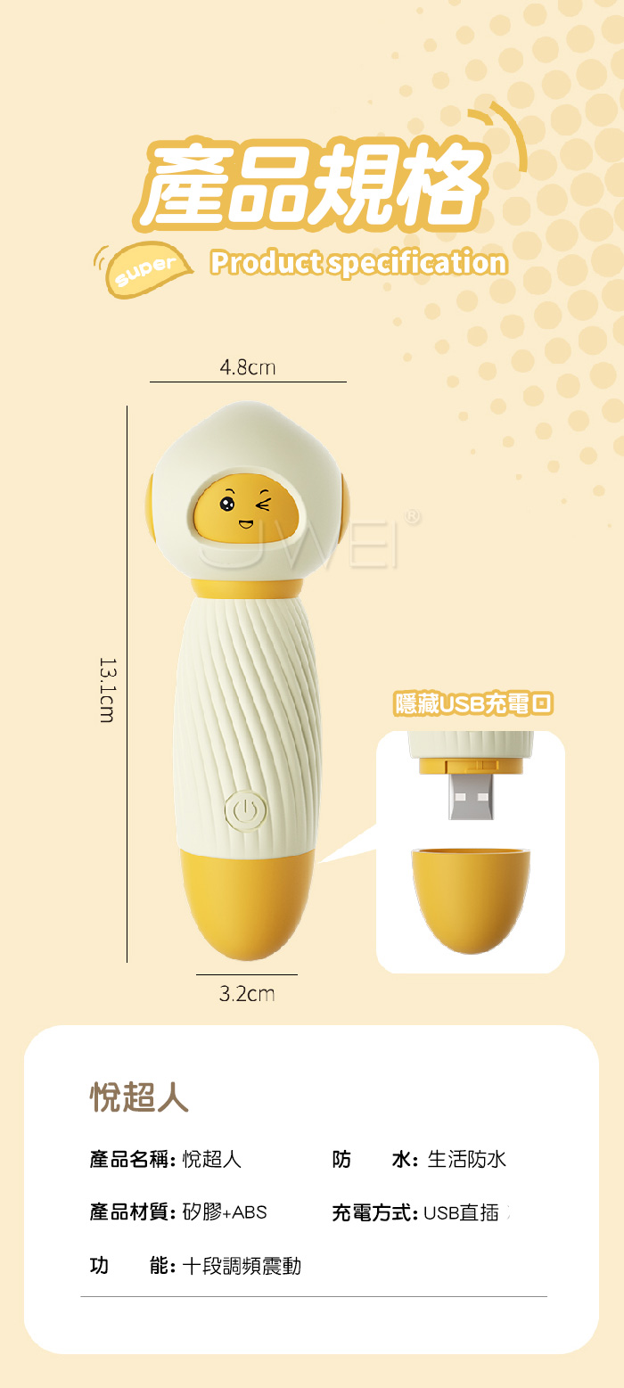 SUPER!!萌物猛攻~悅超人震動棒!玩轉“高潮”~~ 老司機只選AV棒,蜜豆刺激才是真高潮,悅超人一觸即潮! 超強震動12000轉/min急速猛烈,48mm球頭直徑,覆蓋面大狂暴刺激感 直擊高潮,從頭頂酥麻到腳尖!獨特小觸角花式撩逗,感受別樣刺激! ■尺寸:大小詳如圖片標示 ■材質:矽膠、ABS ■供電:USB直插充電 ■特色:10段震動