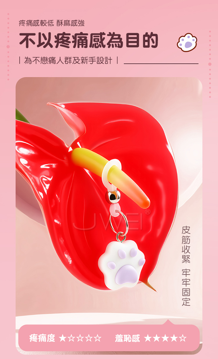 貓爪乳夾,皮筋乳夾低痛感,小巧精緻的同時不失美觀 感受更多溫柔 疼痛感較低 酥麻感強,不以疼痛感為目的,專為不戀痛人群及新手設計 外出佩戴 羞恥感加倍,隔衣出門 隱蔽穿戴,無論峰頭大小緊抱雙峰 ■尺寸:大小詳如圖片標示 ■材質:樹脂