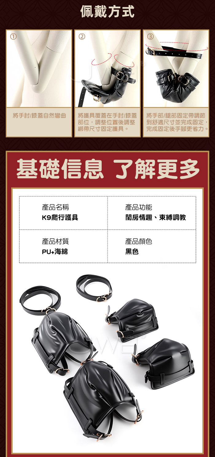 加厚海綿 跪爬不痛,肘膝防護,手肘膝蓋部位進行加厚處理層層加確保暢玩途中不傷害TA的身體。 遊玩更輕鬆,整體由,PU縫製,內含加厚海綿墊適合長時間配戴遊戲。 ■尺寸:大小詳如圖片標示 ■材質:PU+海綿 ■功能:閨房情趣、束縛調教 ■注意:SM道具請以安全、清醒、非強迫為使用原則,使用前請先徵得對方的同意;使用時如有任何不適,請立即停止使用。
