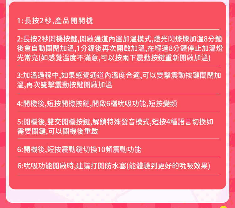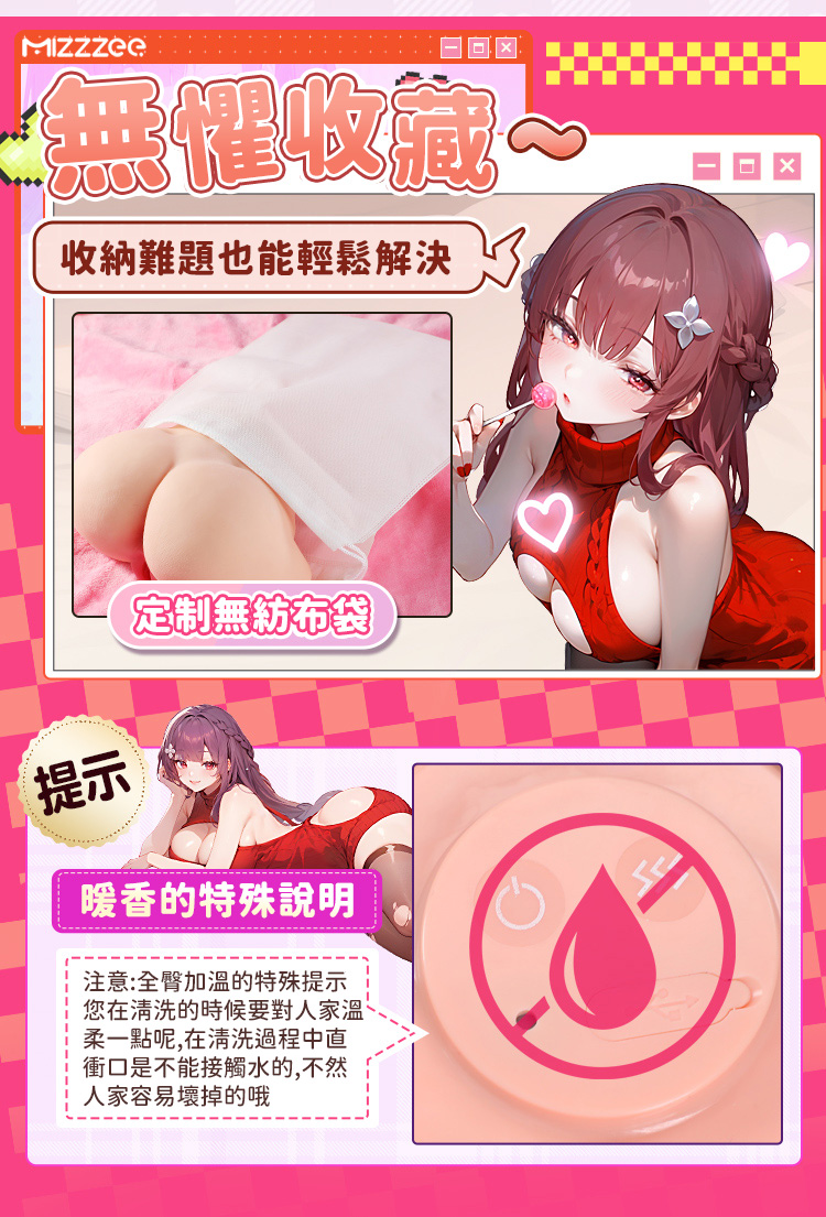 品牌:謎姬 產品名稱:暖香 產品尺寸:28*17*14 產品裸重(KG):3.2 材質:TPE 單雙通道:單 是否貫通:否 是否帶潤滑:是 產品著色:逼真著色 骨架鐵絲還是不鏽鋼:無 顏色:肉色 含包裝尺寸:25*27*17 附包裝重量:3.5 控制類型:自動 查詢防偽:謎姬 產品配置:小包6毫升潤滑 產品賣點:雙色通道,全加溫模式