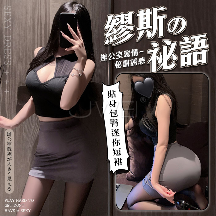 繆斯秘語.胸前挖空露溝貼身包臀超短裙擺秘書裝【T褲+黑上衣+灰裙】