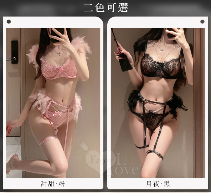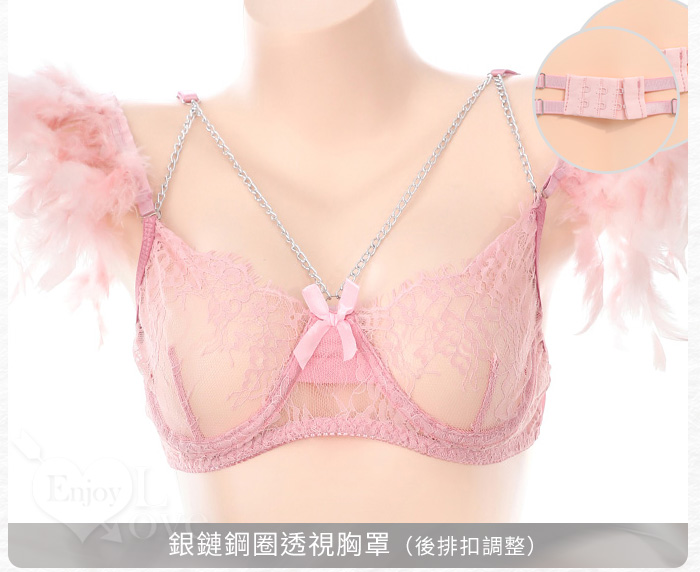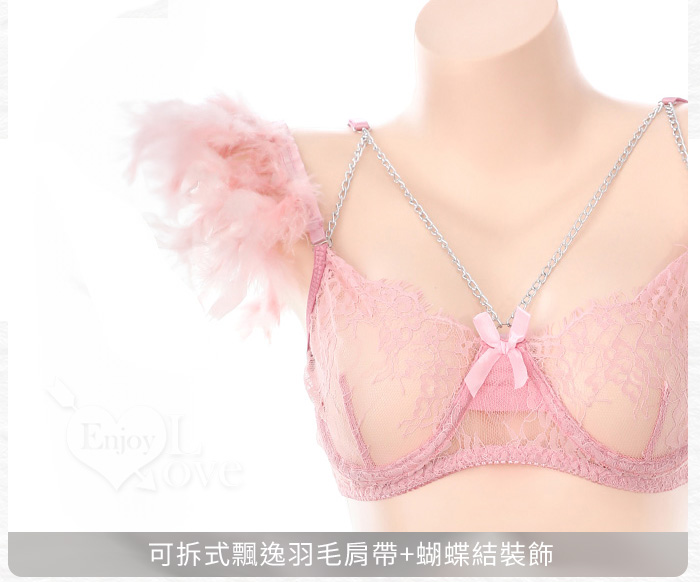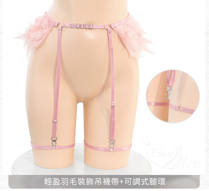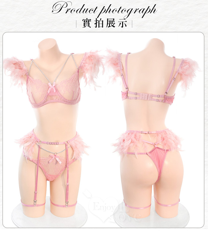 情趣比基尼!蕾絲鋼圈輕柔羽毛銀鍊調情吊襪帶五件式套裝﹝粉﹞