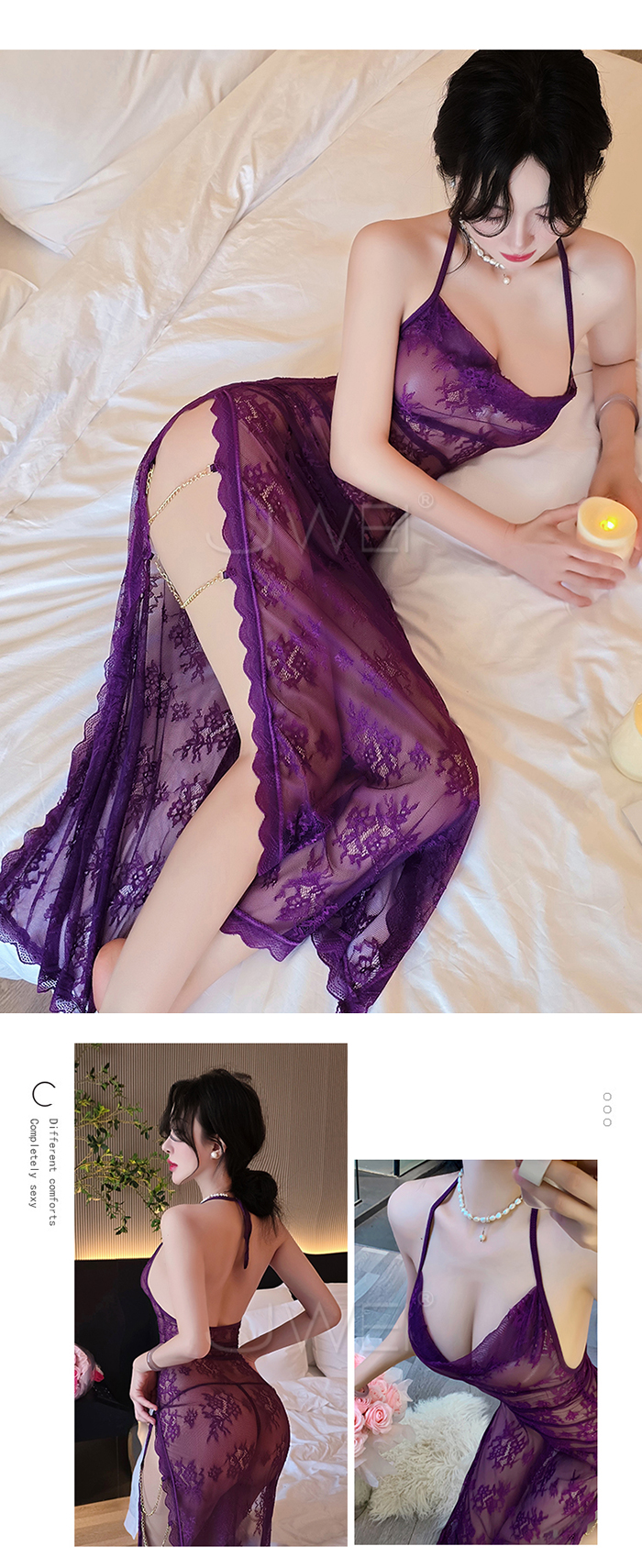| 柔欲佳人.蕾絲蕩領美背半露兩側開衩透視睡裙-紫色【連衣裙+T褲】