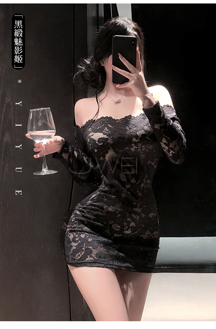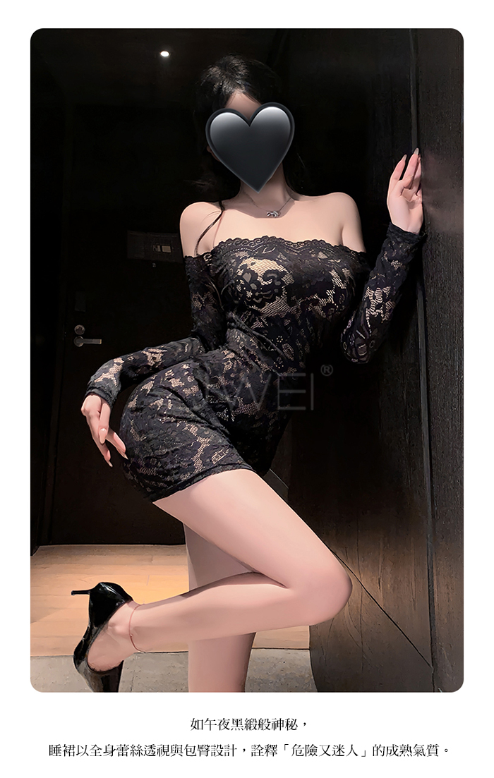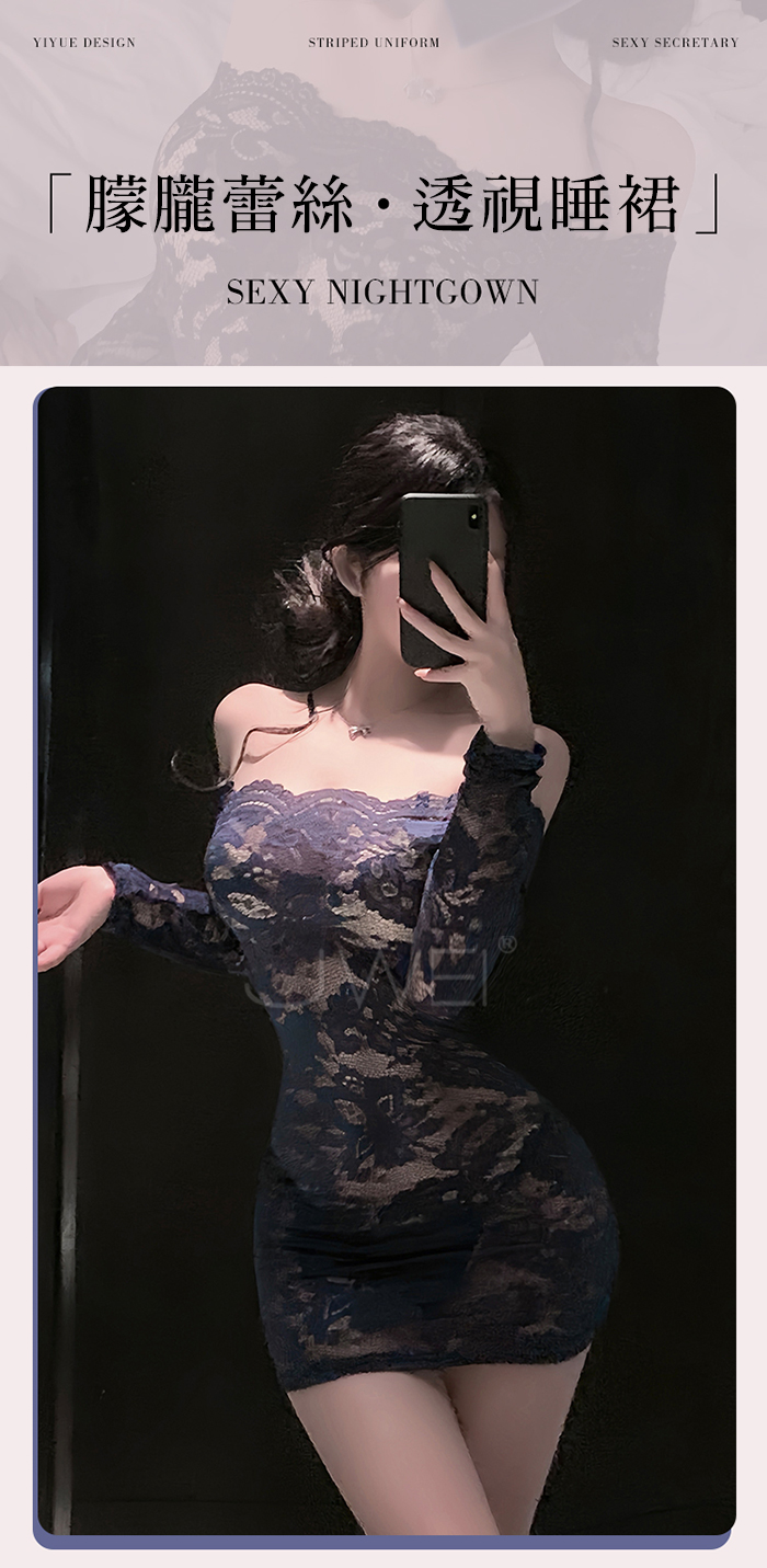 首頁>花蔓朦朧.蕾絲雕花一字領透視包臀睡裙【連身裙+T褲+隱形肩帶-藍色】