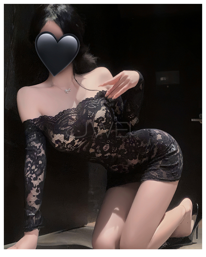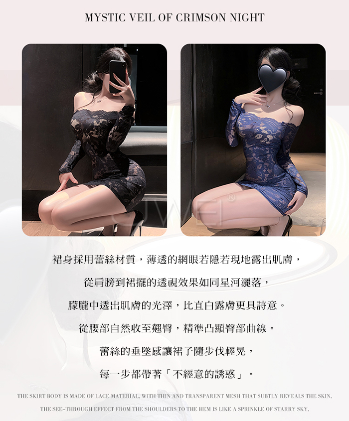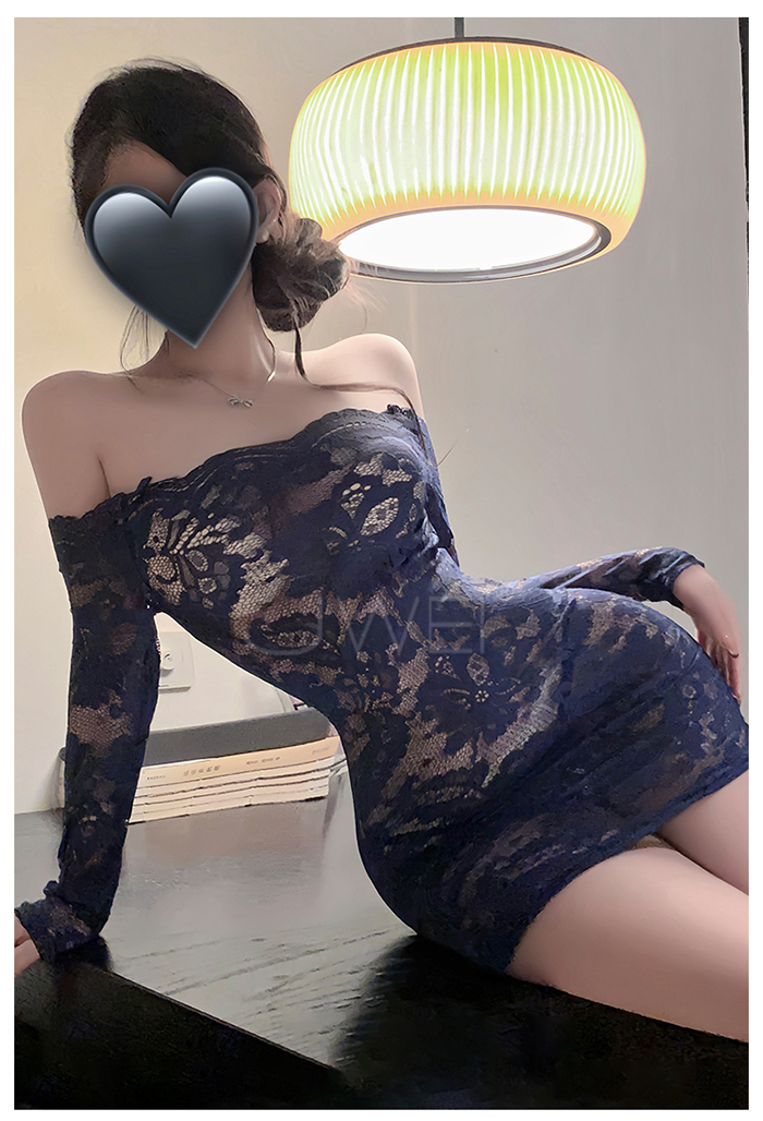 花蔓朦朧.蕾絲雕花一字領透視包臀睡裙【連身裙+T褲+隱形肩帶-藍色】