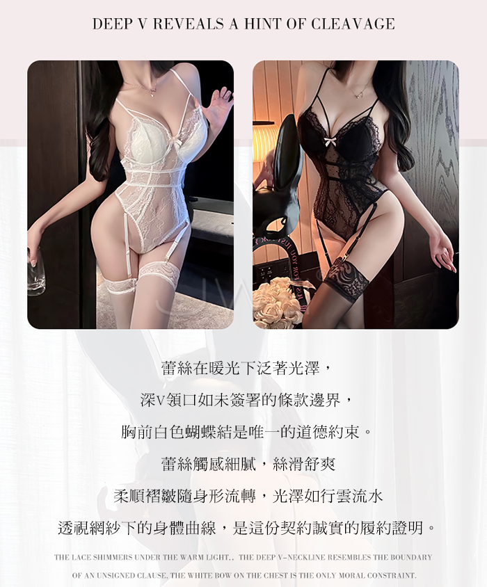 晝夜甜誘.蕾絲深V領口透視網紗暗扣開襠吊襪帶馬甲【黑色】