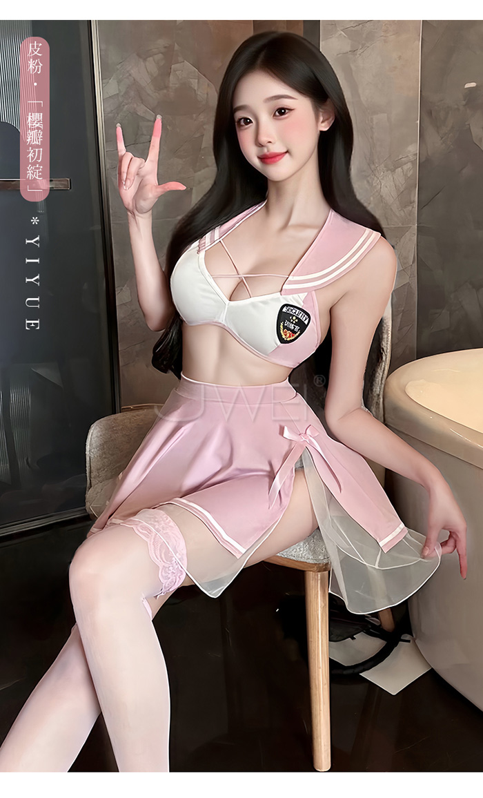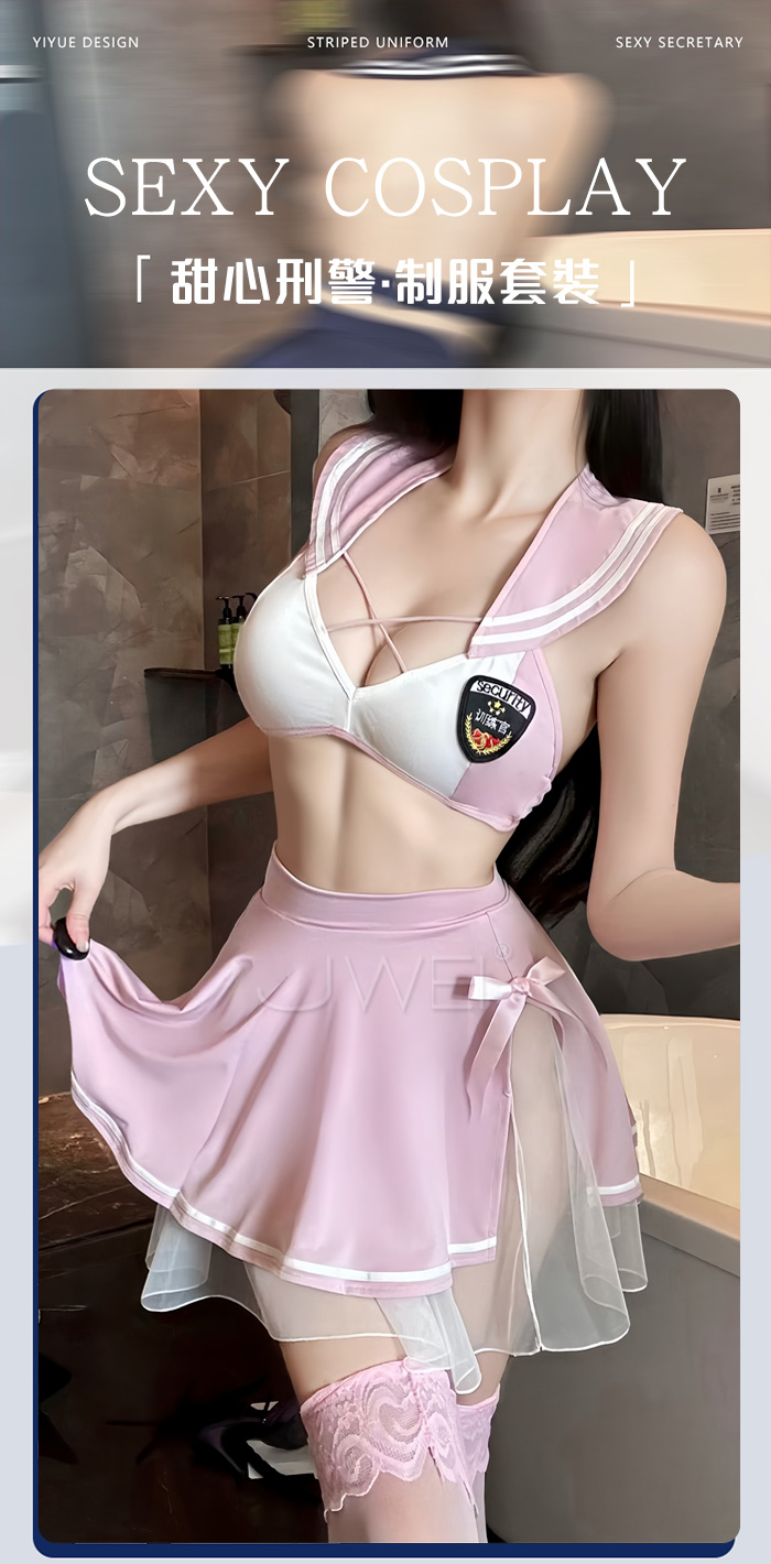 ►您現在的位置:首頁>甜心刑警.胸前交叉繫帶清純百褶透視白紗COS制服套裝【上衣+短裙-粉+白】