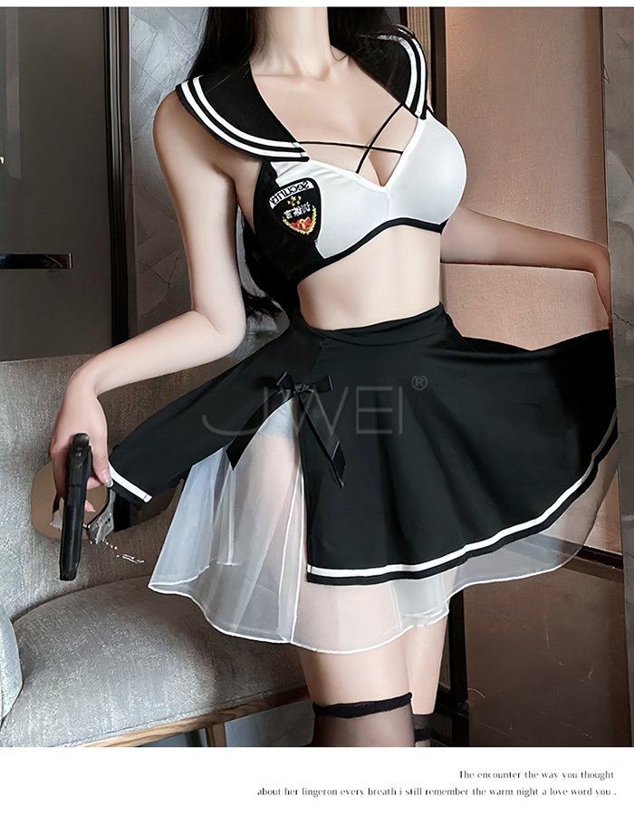 | 甜心刑警.胸前交叉繫帶清純百褶透視白紗COS制服套裝【上衣+短裙-黑+白】