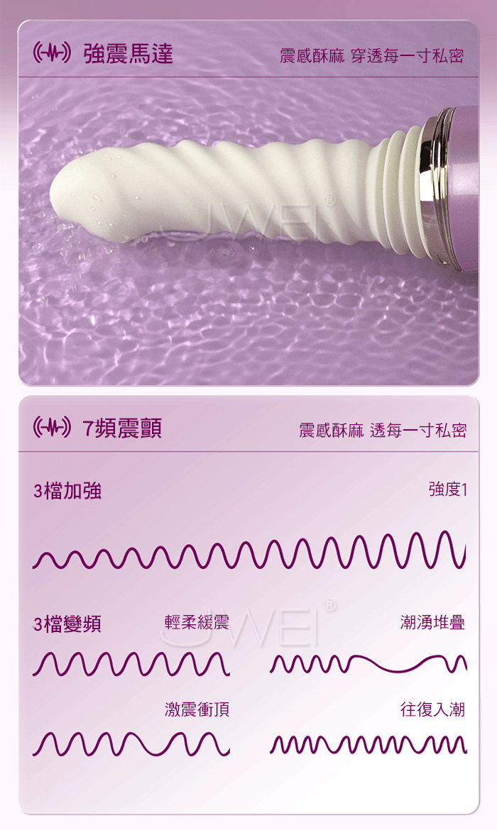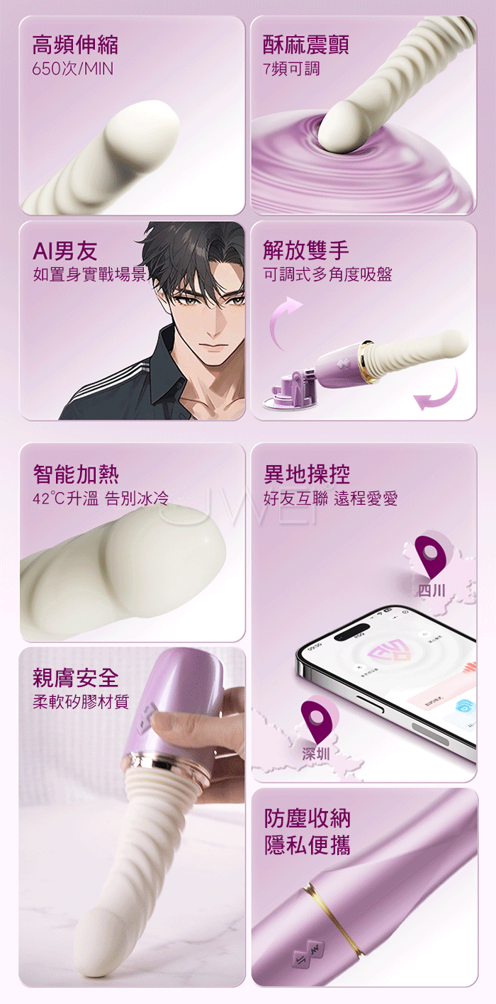 長距離 高頻率,體驗前所未有的真實沖撞感 長距深入高頻衡擊,專攻敏成點每次都直抵核心 強勁震動,酥麻入魂,滿足你對不停歇的快感要求 產品規格 ■尺寸:大小詳如圖片標示 ■材質:矽膠+ABS ■功能:7頻伸縮、7頻震動、APP智控、加溫