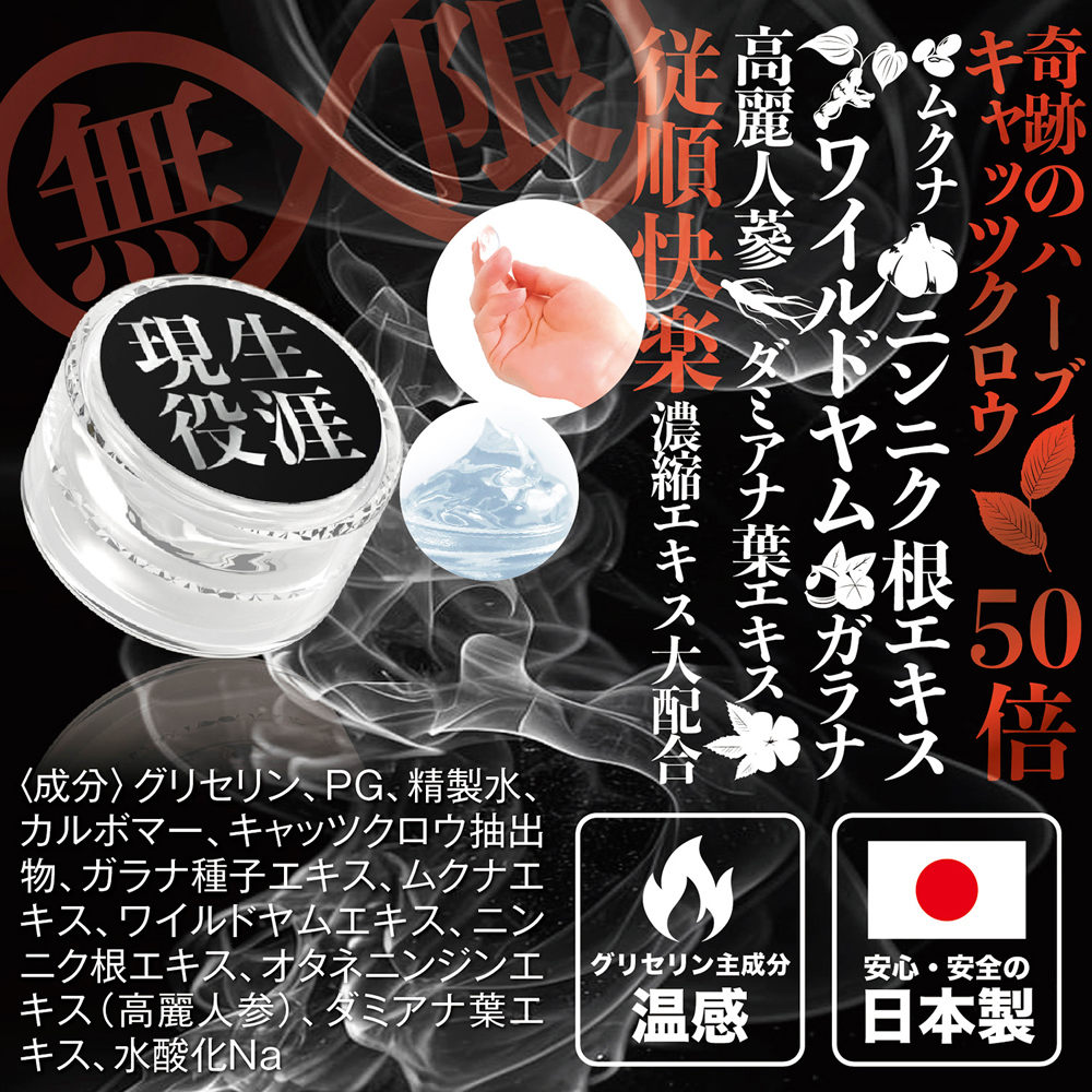 成分:甘油、丙二醇、純水、卡波姆、貓爪藤萃取物、瓜拿納種子萃取物、黧豆萃取物、野山藥萃取物、大蒜根萃取物、高麗人參萃取物、達米阿那葉萃取物、氫氧化鈉包裝:紙盒包裝