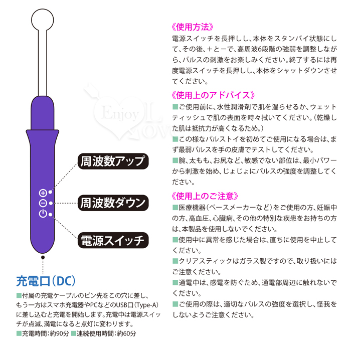日文簡述: 新体験! 快感と官能のパルスショック! 4種の機能別アタッチメントから放たれる6段階パルスの 刺激的な快感に痺れる! 使用箇所の説明とご注意 ■敏感度の高い部分…舌、乳首、外陰部、つま先など ■中程度の敏感度の高い部分… 首、胴体側面、胸部、腹筋、内腿、足裏 ■敏感度の低い部位…胸部、背中、腕、その他の太もも、臀部 《使ってはいけない部分》 眼球、外耳道、傷口、尿道、肛門など、敏感な部位への接触はおやめください。 また、医療機器(ペースメーカーなど)をご使用の方、妊娠中の方、高血圧、心臓病、 その他の特別な疾患をお持ちの方は、本製品を使用しないでください。 使用中に異常を感じた場合は、直ちに使用を中止してください。 《使い方》 ご使用前に、水性潤滑剤で肌を湿らせるか、ウェットティッシュで肌の表面を時々拭いてください。 (乾燥した肌は抵抗力が高くなるため。) 用意ができたら、クリアスティックを本体に差し込んで、電源スイッチを長押しし、本体をスタンバイ状態にします。、 その後、+と-で、高周波6段階の強弱を調整しながら、パルスの刺激を操作します。 やけどを防ぐため先端を同じ個所に長時間当て続けず、先端をちょんちょんと肌に当てるクイックコンタクト法、 先端を肌にあて、スッと撫でるスライディングコンタクト法の併用をおすすめします。 終了するには再度電源スイッチを長押しし、本体をシャットダウンさせてください。 ※1…この様なパルストイを初めてご使用になる場合は、まず最弱パルスを手の皮膚でテストしてください。 ※2…腕、太もも、お尻など、敏感でない部位は、最小パワーから刺激を始め、じょじょにパルスの強度を調整してください。 《本体の充電》 ■付属の充電ケーブルのピン先を本体底の小穴に差しこみ、もう一方はスマホ充電器やPCなどのUSB口(Type-A)に差し込むと 充電を開始します。充電中は電源スイッチが点滅、満電になると点灯に変わります。 ■充電時間:約90分 ■連続使用時間:約60分 《本体の取り扱いについて》 クリアスティックはガラス製ですので、取り扱いにはご注意ください。 通電中は、感電を防ぐため、通電部周辺に触れないでください。 ご使用の際は、適切なパルスの強度を選択し、怪我をしないようご注意ください。